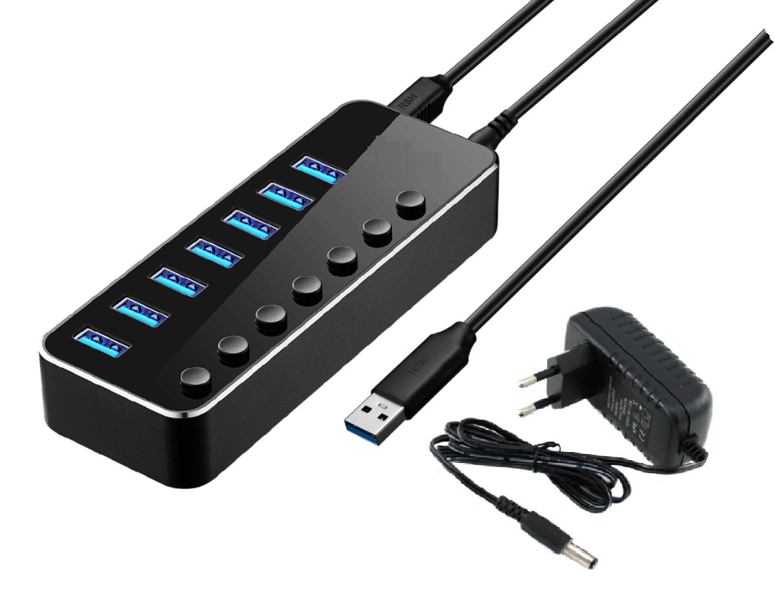 У комплект поставки входить блок живлення, що дозволяє заряджати акумулятори зовнішніх пристроїв (мобільних телефонів, планшетів, тощо) без підключення хаба до ноутбука.